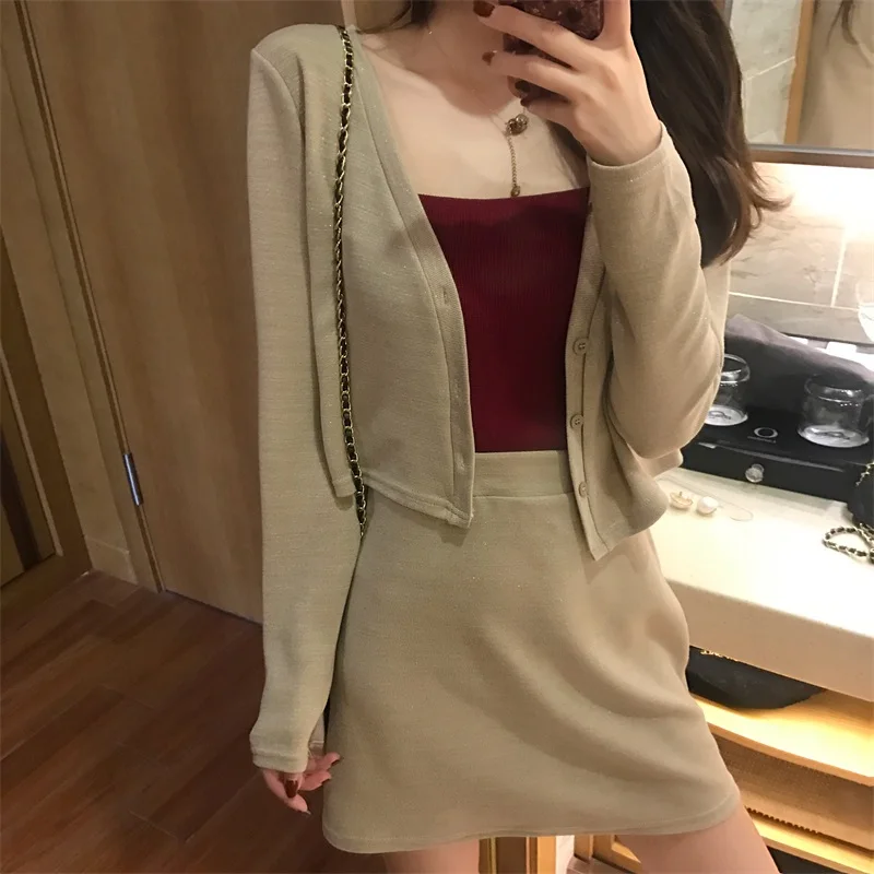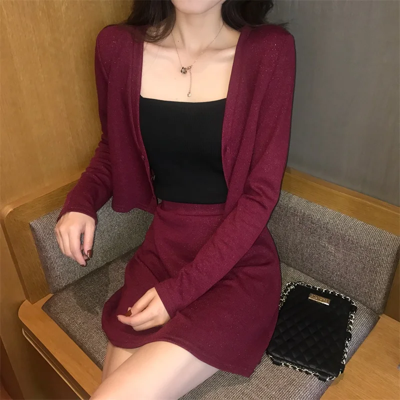 2021 Autumn Women Sweater Skirt Suit Casual Knitted Female Mini Skirts Suits Ladies 2 Piece Set Cardigan Coat Jacket Skirt Sets