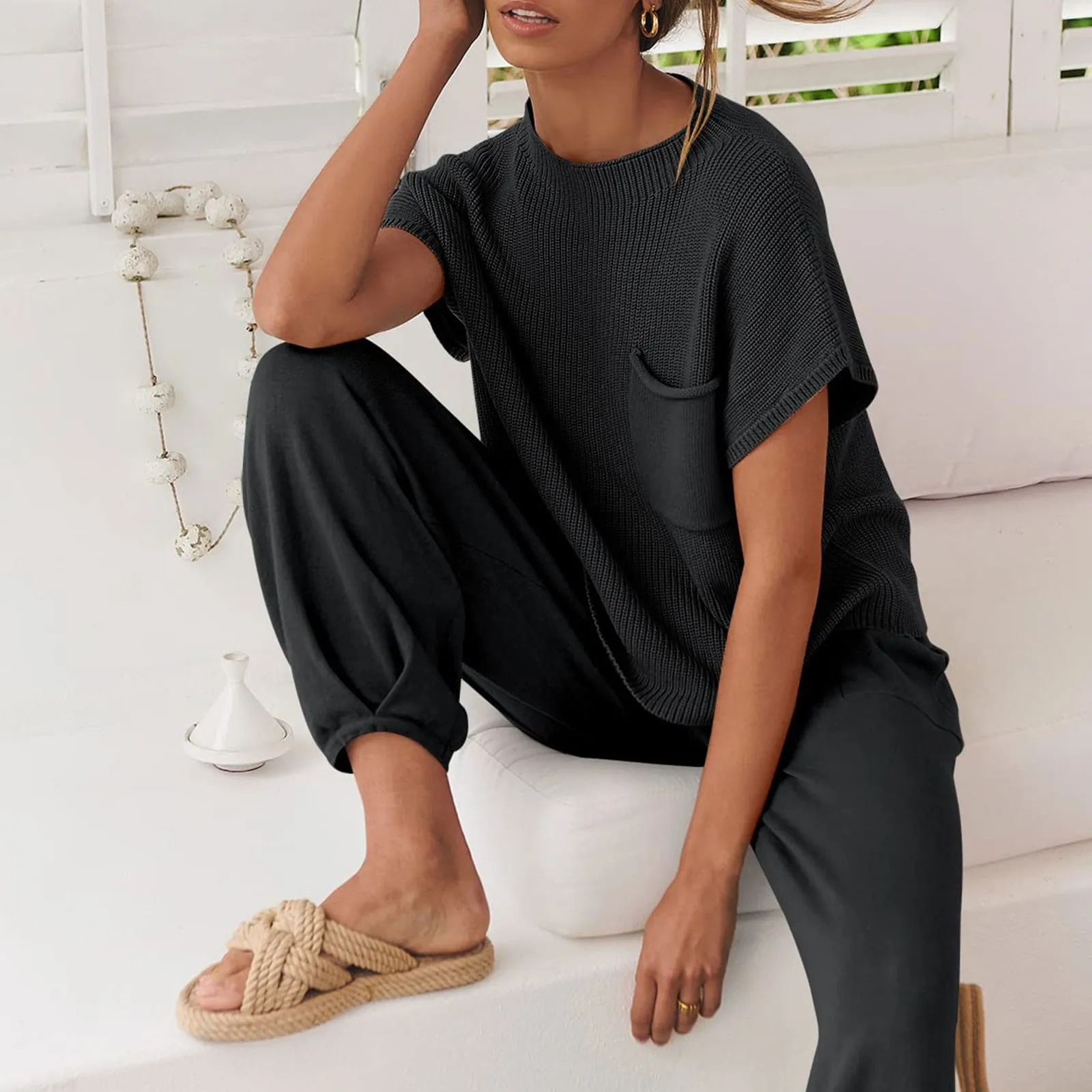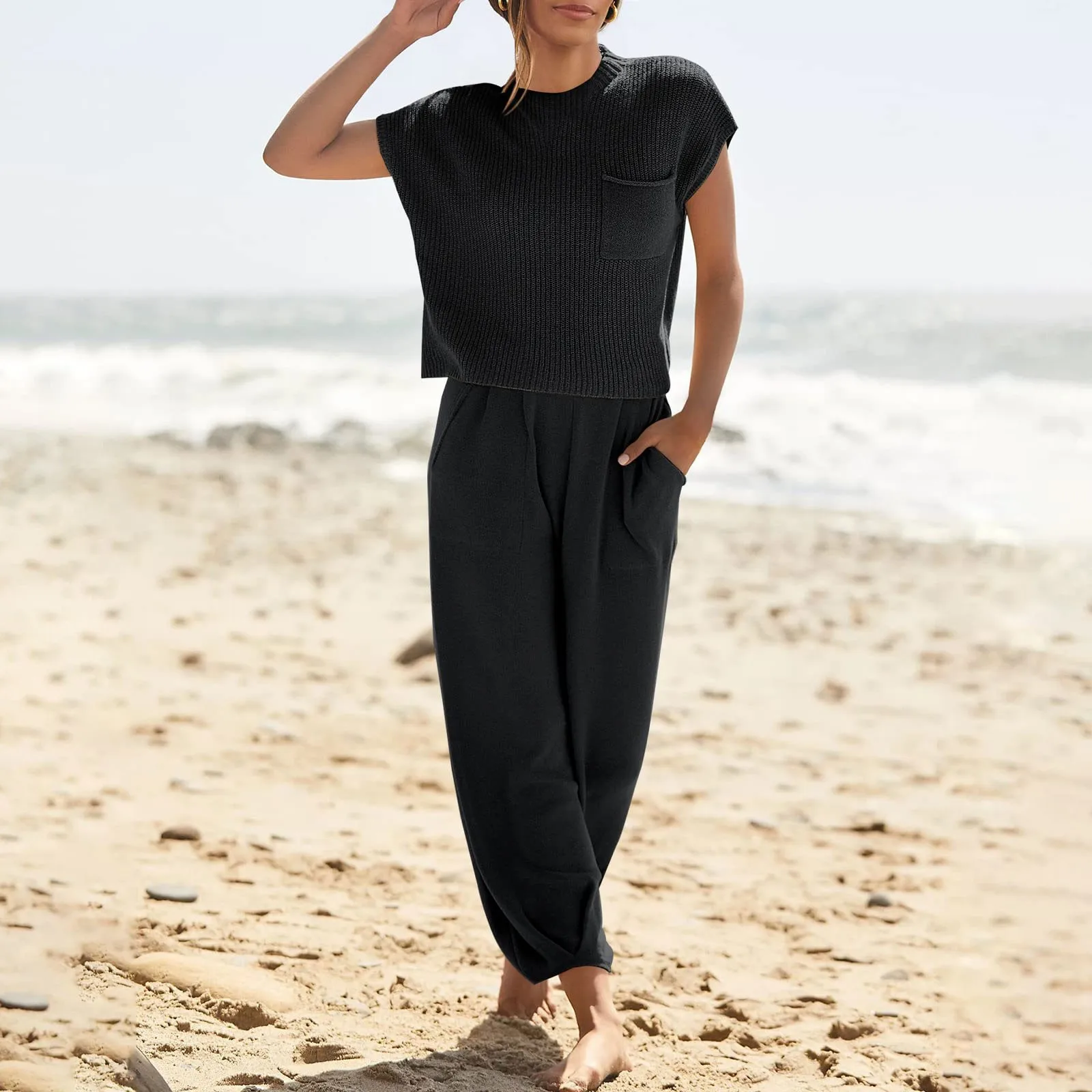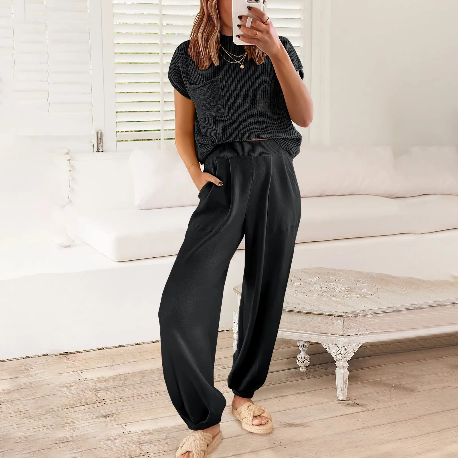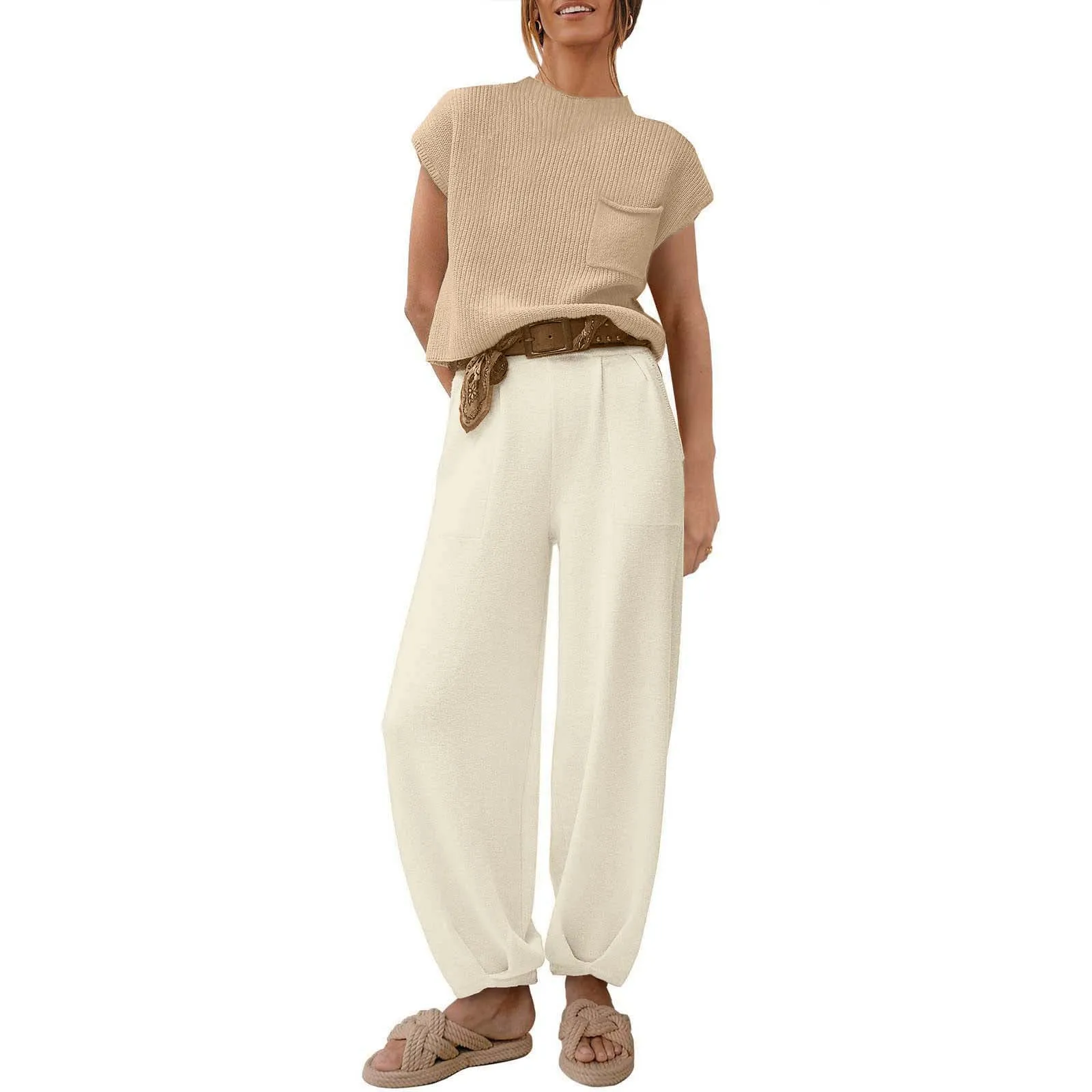 2025 Spring Knitted Women's Sweater Suit Sleeveless Tank Wide-leg Pants Suits Female Trendy Autumn Ladies Set Foot Suit Pantsuit