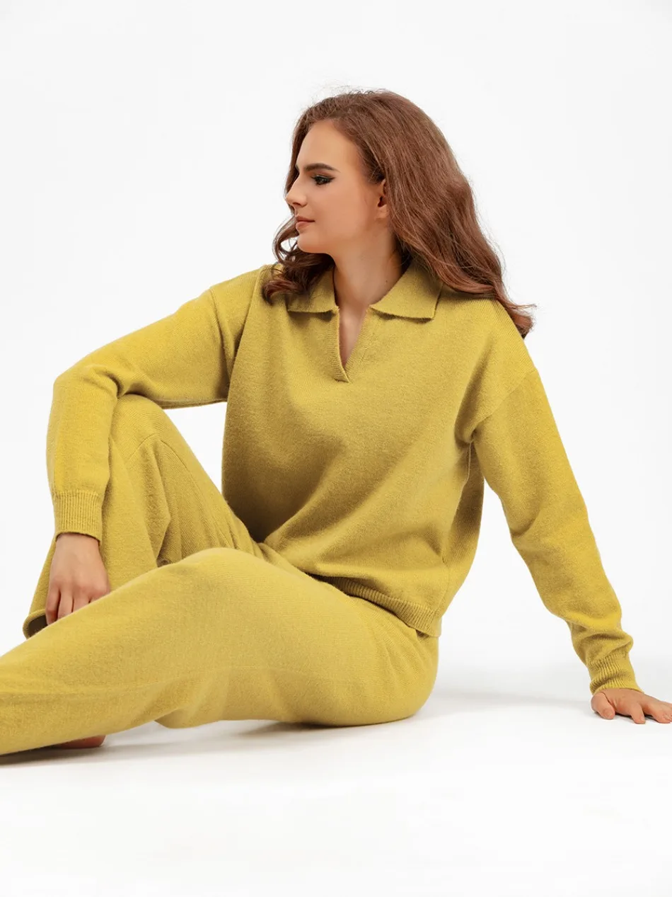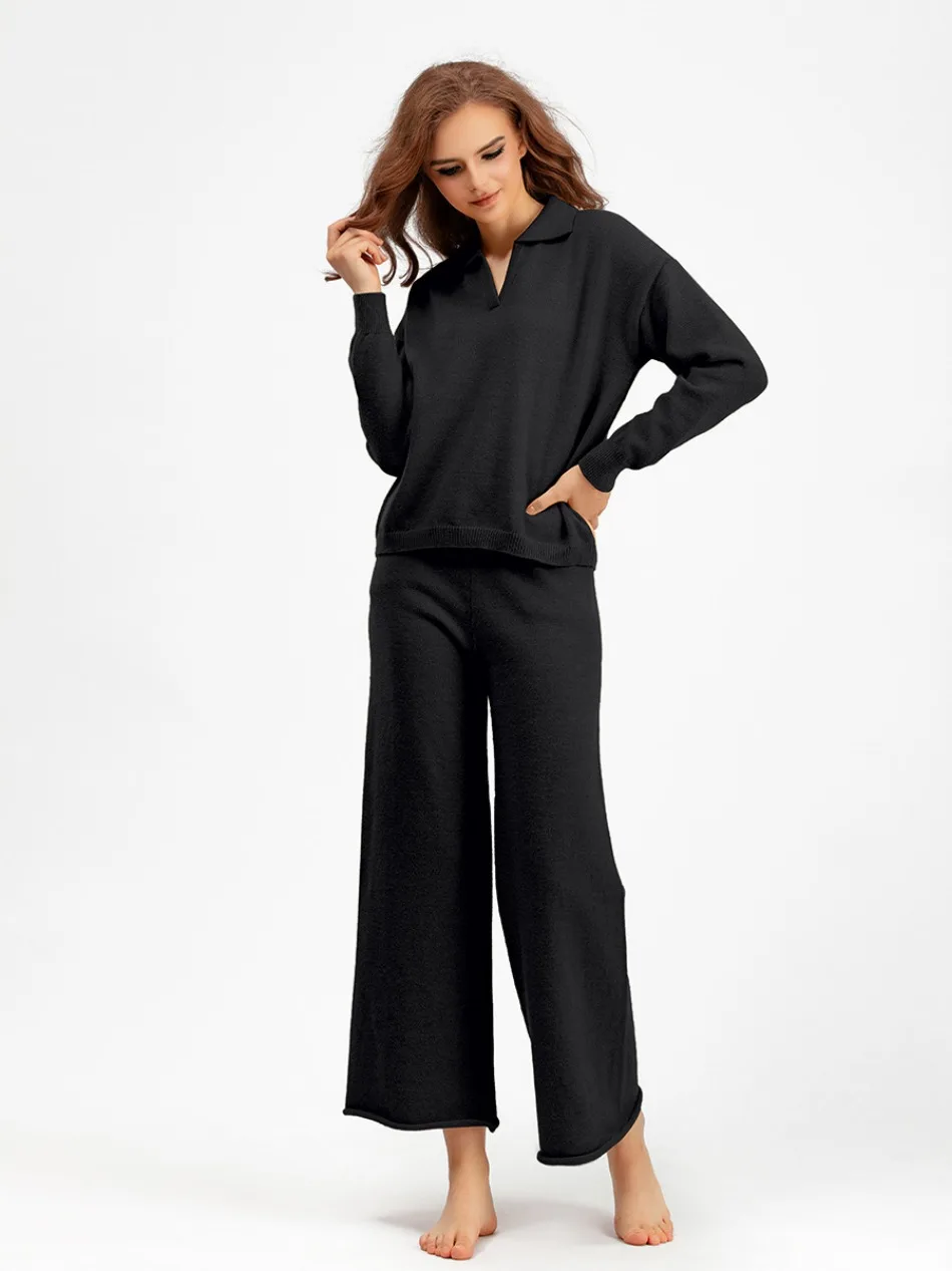 Autumn Winter Women's Knitted Suit Loose Polo Neck Sweater New In Matching Wide Leg Pants Sets for Women 2 Pieces Pullovers