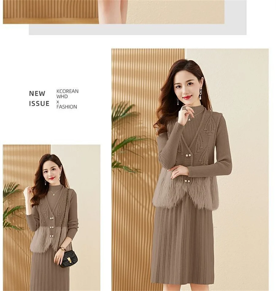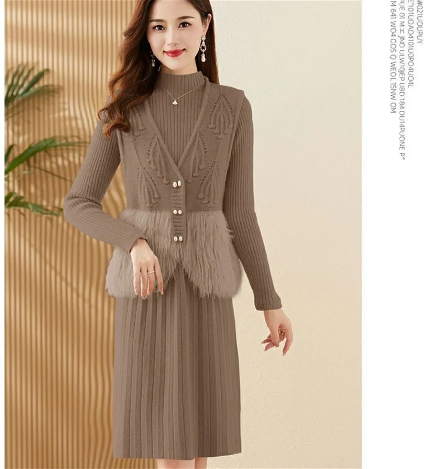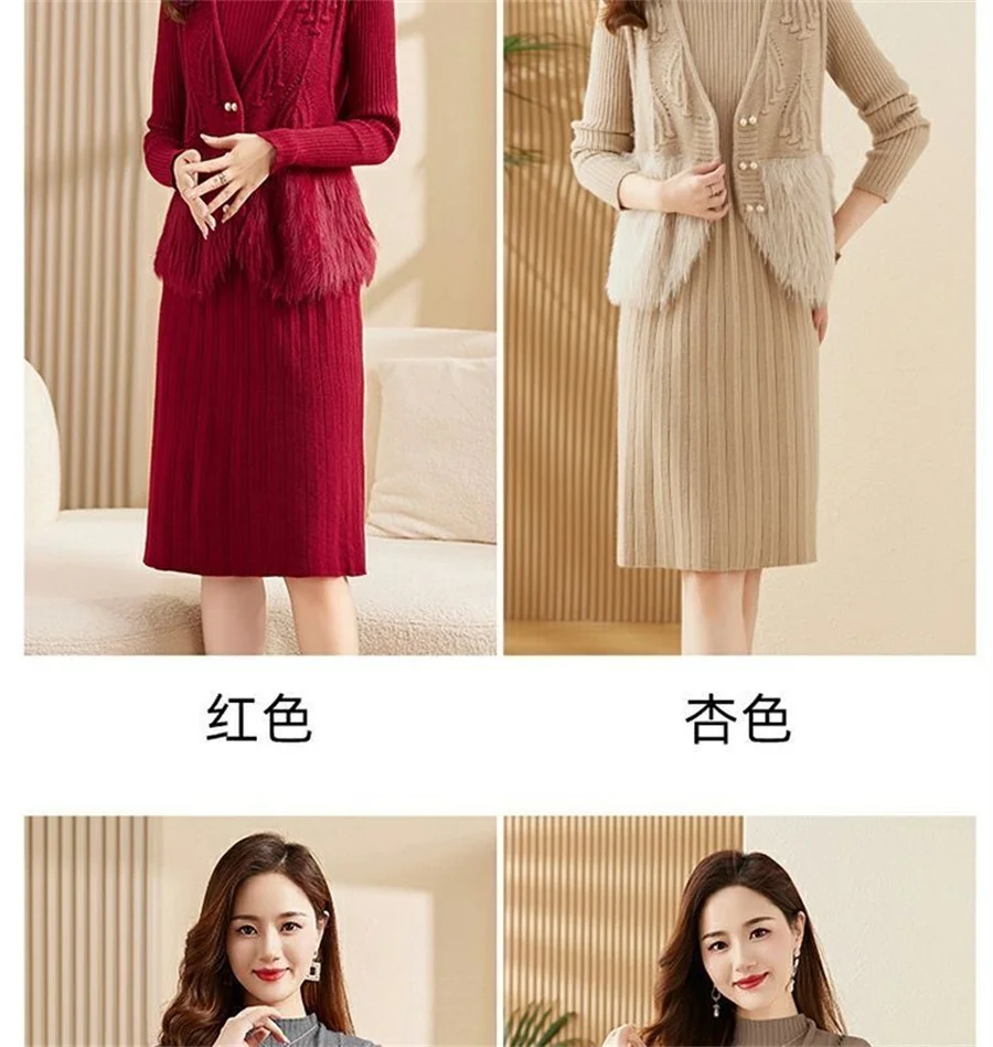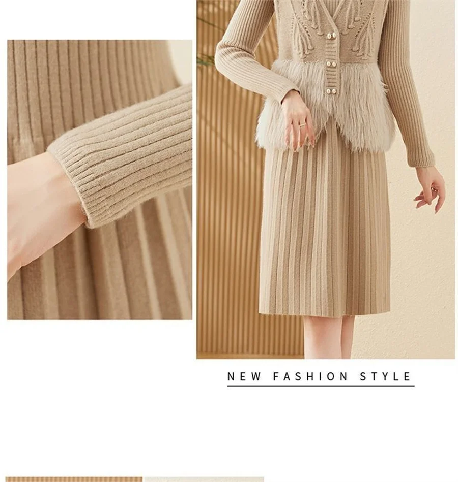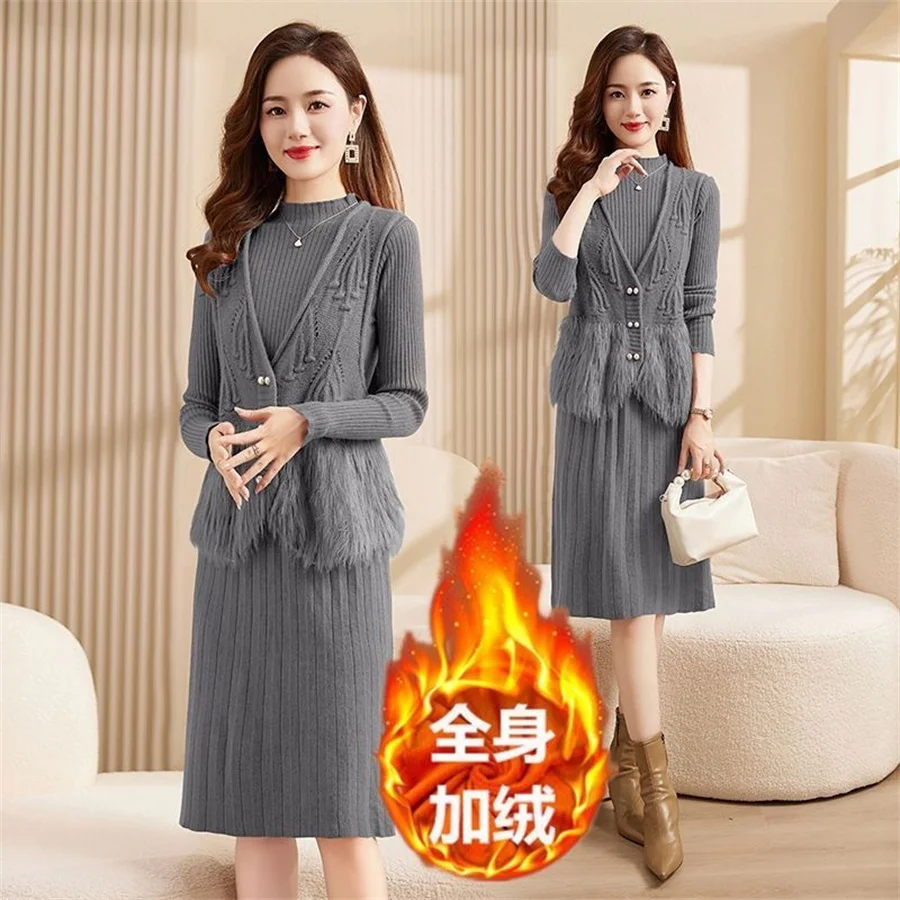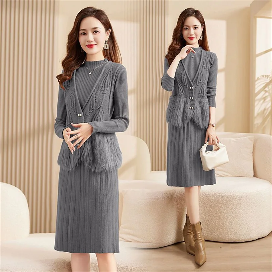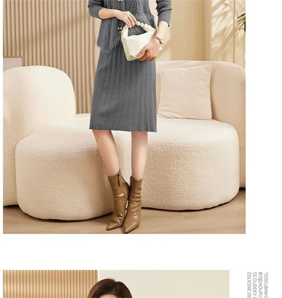 Autumn Winter Women's Knitted Sweater Skirt Two Piece Set Women Slim Fit Elegant Tops Female Suits Office Lady Knitting Outfit