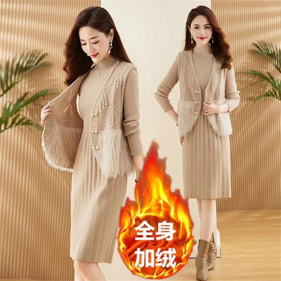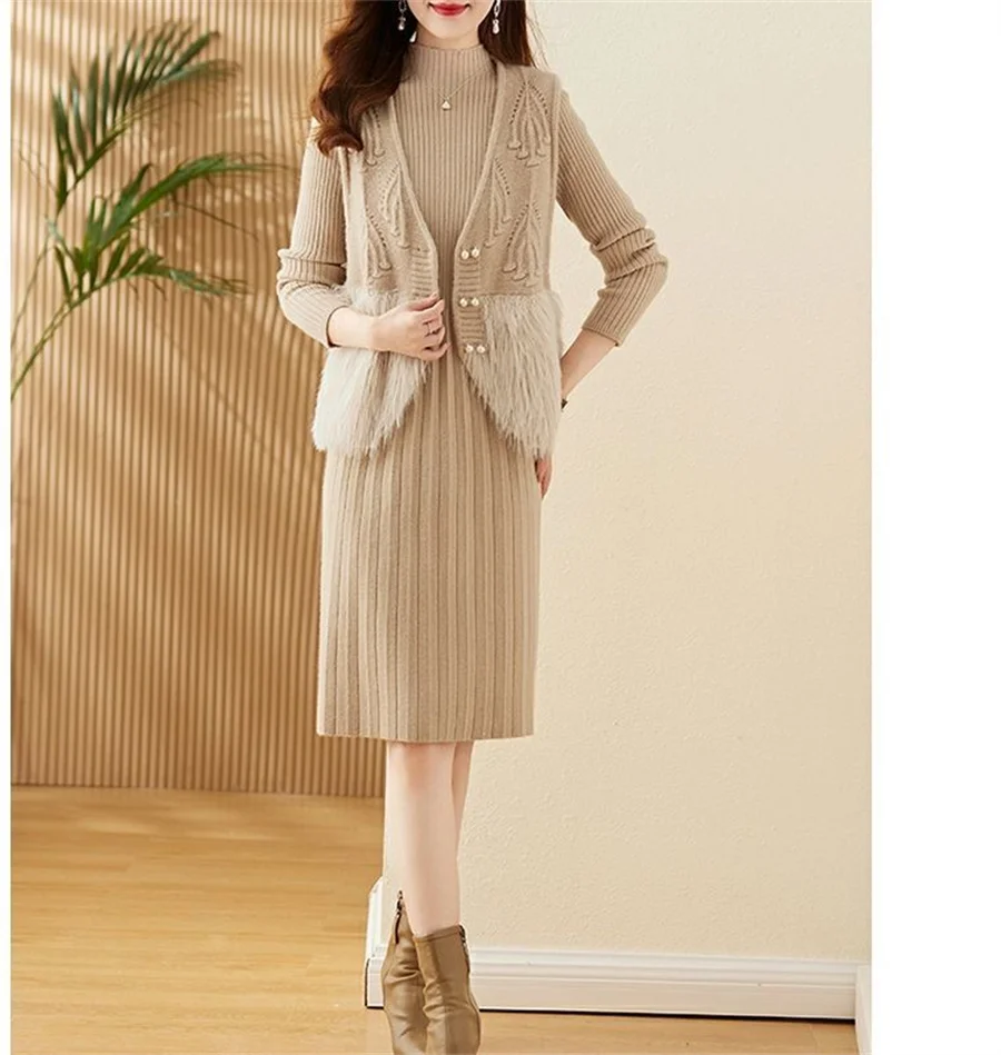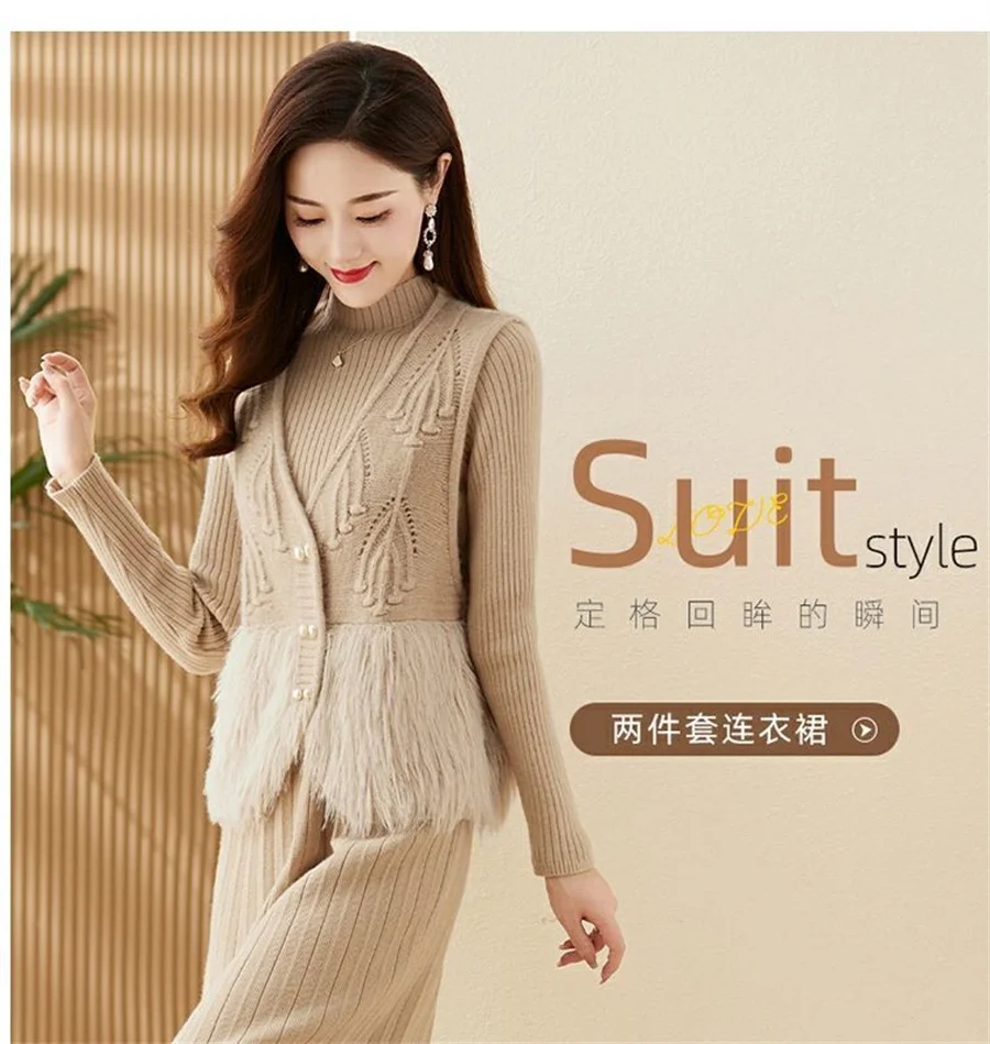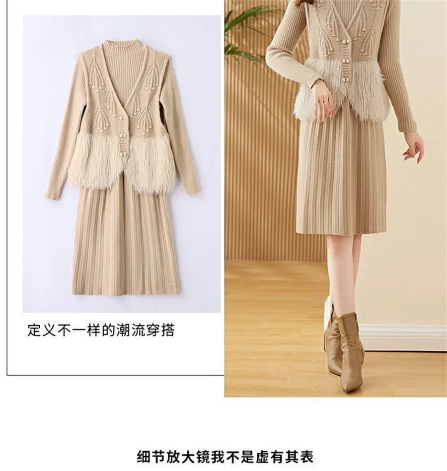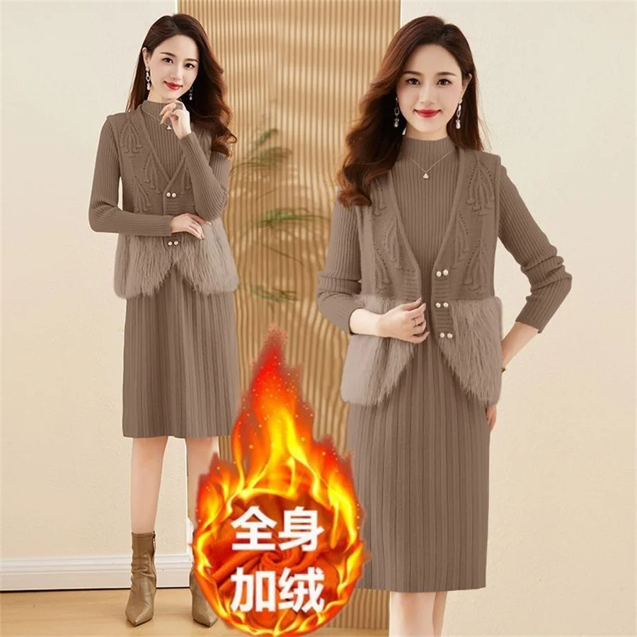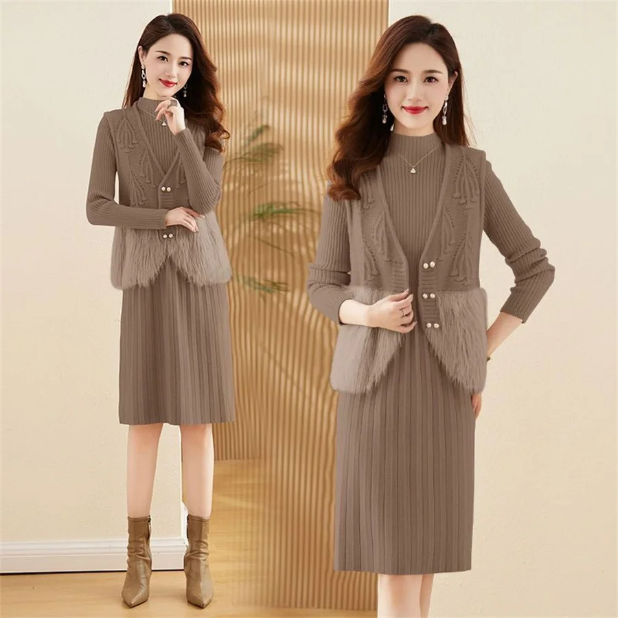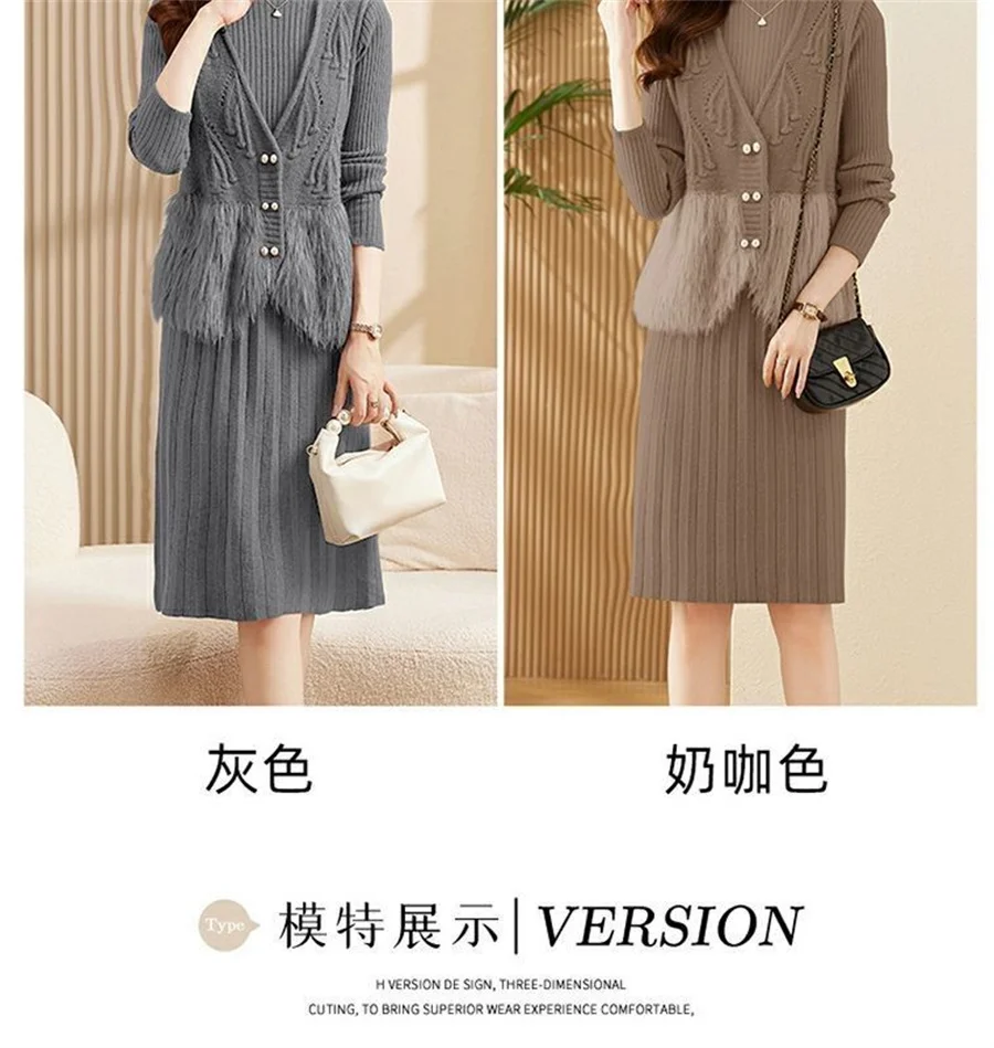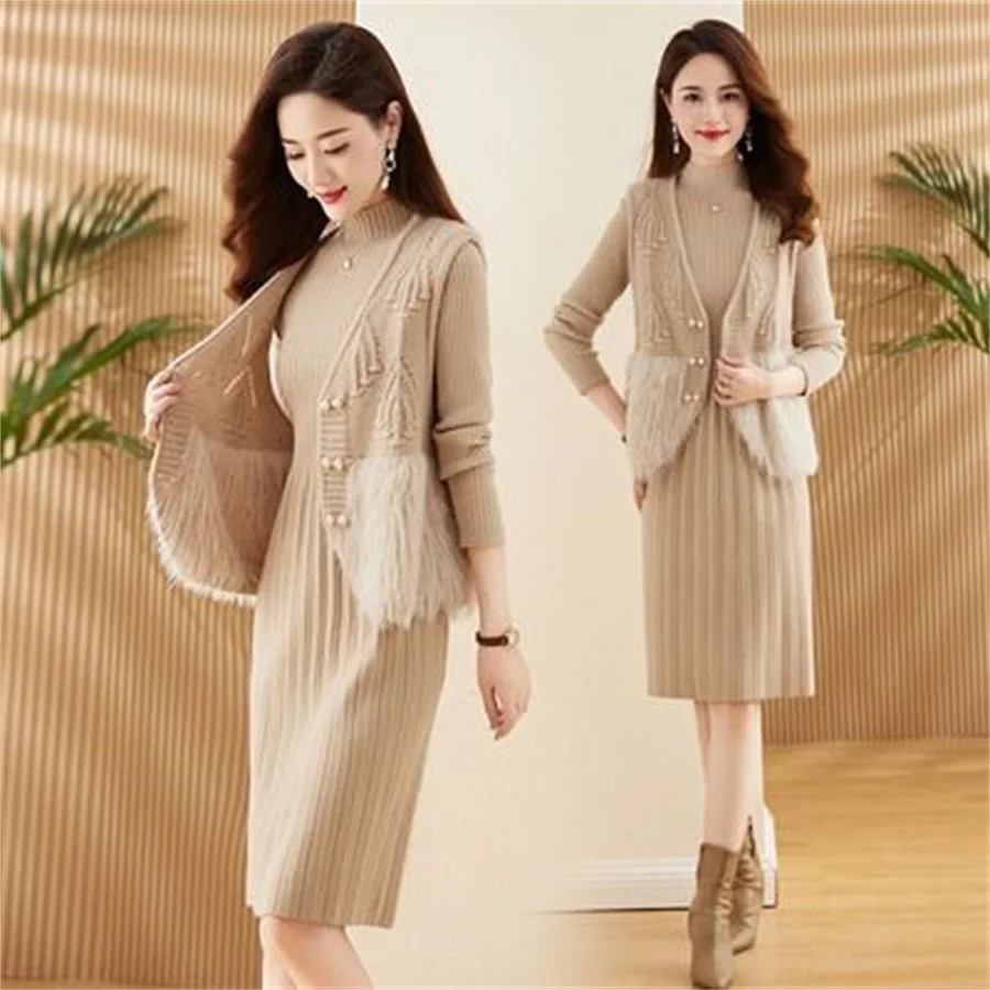 Autumn Winter Women's Knitted Sweater Skirt Two Piece Set Women Slim Fit Elegant Tops Female Suits Office Lady Knitting Outfit