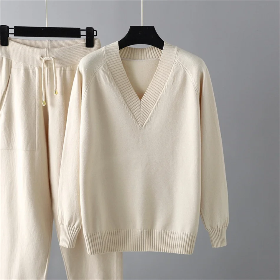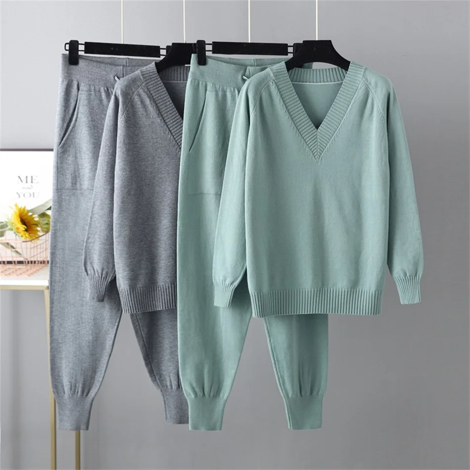 Winter Women Knitted Sport Suits Two Piece Set Women Outfit Drawstring Jogging Harem Pants V Neck Pullover Sweater Set Knitwear