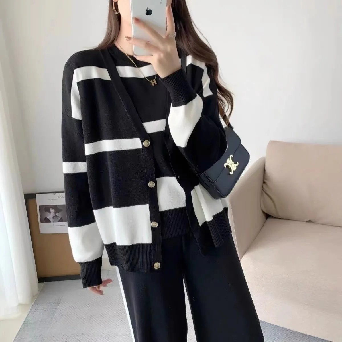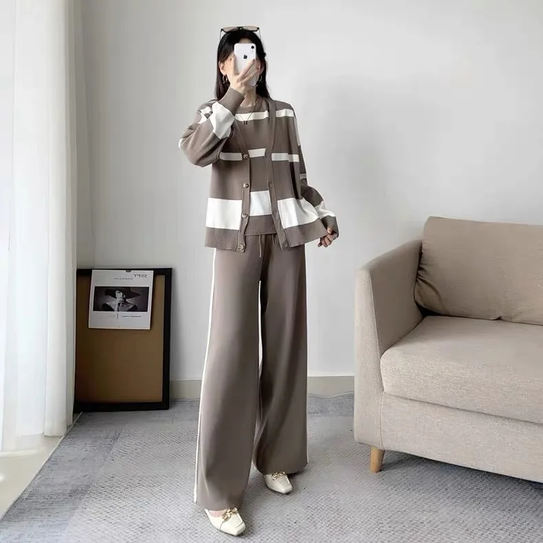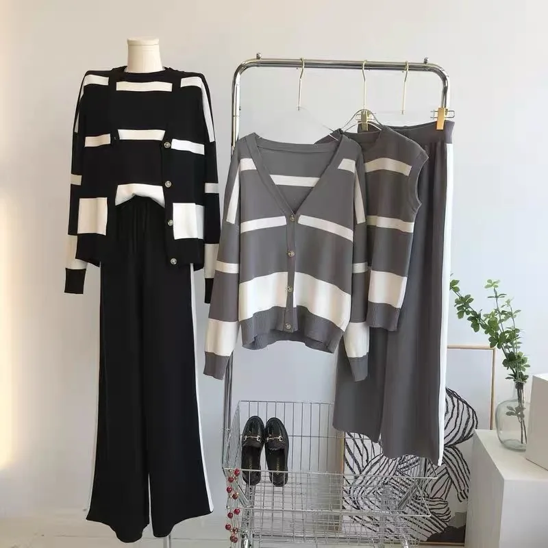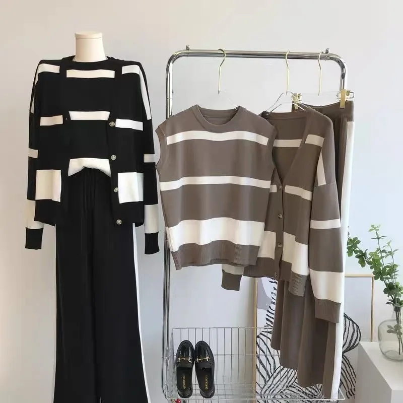 Women Sweater 3 Piece Set Tracksuit 2024 Autumn Winter Fashion Striped Cardigan Coat + O Neck Vest + Pants Knitted Suits Outfits